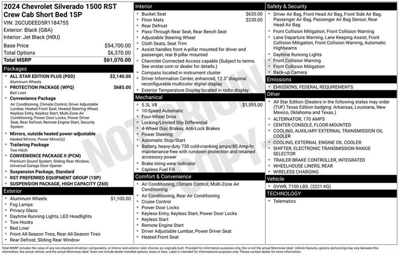 Black 2024 Chevrolet Silverado 1500 RST 4WD 10-Speed Automatic EcoTec3 5.3L V8 40 Point Used Car Inspection, Full Detail, Silverado 1500 RST, 4D Crew Cab, EcoTec3 5.3L V8, 10-Speed Automatic, 4WD, Black, Black Cloth, 10-Way Power Driver Seat w/Lumbar, 12.3" Multicolor Reconfigurable Digital Display, 120-Volt Bed Mounted Power Outlet, 120-Volt Interior Power Outlet, 220 Amp Alternator, 6-Speaker Audio System, All Star Edition Plus, All-Star Edition, Auto-Locking Rear Differential, Bluetooth® For Phone, Chevrolet Connected Access Capable, Chevytec Spray-On Black Bedliner, Cloth Seat Trim, Color-Keyed Carpeting Floor Covering, Convenience Package, Convenience Package II, Deep-Tinted Glass, Dual Rear USB Ports (Charge Only), Dual-Zone Automatic Climate Control, Electric Rear-Window Defogger, Electrical Steering Column Lock, Electronic Cruise Control, Electronic Stability Control, External Engine Oil Cooler, EZ Lift Power Lock & Release Tailgate, Forward Collision Alert, Front fog lights, Front Frame-Mounted Black Recovery Hooks, Front LED Fog Lamps, Front Pedestrian Braking, Front Rubberized Vinyl Floor Mats, Fully automatic headlights, HD Rear Vision Camera, Heated Driver & Front Outboard Passenger Seats, Heated Power-Adjustable Outside Mirrors, Heated Steering Wheel, High Capacity Suspension Package, High Gloss Black Mirror Caps, Hitch Guidance, Hitch Guidance w/Hitch View, In-Vehicle Trailering System App, Inside Rear-View Mirror w/Tilt, Integrated Trailer Brake Controller, Keyless Open & Start, Lane Keep Assist w/Lane Departure Warning, LED Cargo Area Lighting, OnStar & Chevrolet Connected Services Capable, Power Front Windows w/Driver Express Up/Down, Power Front Windows w/Passenger Express Down, Power Rear Windows w/Express Down, Power Sliding Rear Window w/Rear Defogger, Preferred Equipment Group 1SP, Premium Bose 7-Speaker Sound System, Protection Package, Rear 60/40 Folding Bench Seat (Folds Up), Rear Rubberized-Vinyl Floor Mats, Rear Wheelhouse Liners, Remote Vehicle Starter System, SiriusXM w/360L, Standard Tailgate, Steering Wheel Audio Controls, Theft Deterrent System (Unauthorized Entry), Traction control, Trailering Package, Universal Home Remote, Wheels: 20" x 9" Painted Aluminum, Wi-Fi Hot Spot Capable, Wrapped Steering Wheel.