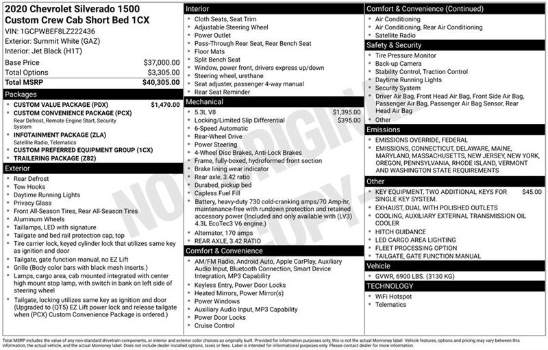 Summit White 2020 Chevrolet Silverado 1500 Custom RWD 6-Speed Automatic Electronic with Overdrive EcoTec3 5.3L V8 40 Point Used Car Inspection, Full Detail, Silverado 1500 Custom, 4D Crew Cab, EcoTec3 5.3L V8, 6-Speed Automatic Electronic with Overdrive, RWD, Summit White, Black Cloth, 170 Amps Alternator, 3.5" Diagonal Monochromatic Display, 4G LTE Wi-Fi Hot Spot Capable, Bluetooth® For Phone, Body Color Grille, Chevrolet Connected Access Capable, Color-Keyed Carpeting Floor Covering, Compass, Custom Convenience Package, Custom Value Package, Deep-Tinted Glass, Electric Rear-Window Defogger, EZ Lift Power Lock & Release Tailgate, Front Frame-Mounted Black Recovery Hooks, Front Rubberized Vinyl Floor Mats, Hitch Guidance, Infotainment Package, LED Cargo Area Lighting, Locking Tailgate, Manual Tilt-Wheel Steering Column, OnStar & Chevrolet Connected Services Capable, Power Door Locks, Power Front Windows w/Driver Express Up/Down, Power Front Windows w/Passenger Express Down, Power Rear Windows w/Express Down, Preferred Equipment Group 1CX, Rear 60/40 Folding Bench Seat (Folds Up), Rear Rubberized-Vinyl Floor Mats, Remote Keyless Entry, Remote Vehicle Starter System, SiriusXM Radio, Steering Wheel Mounted Electronic Cruise Control, Theft Deterrent System (Unauthorized Entry), Trailering Package.