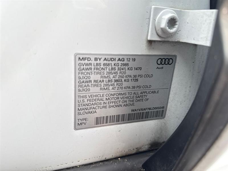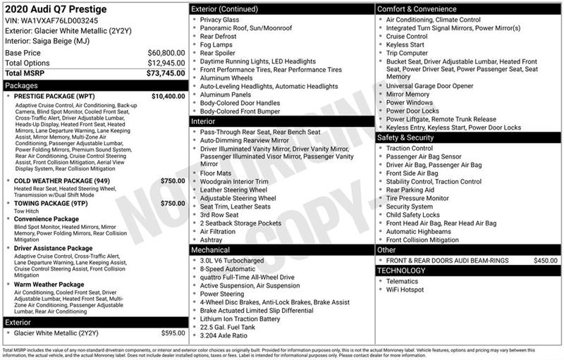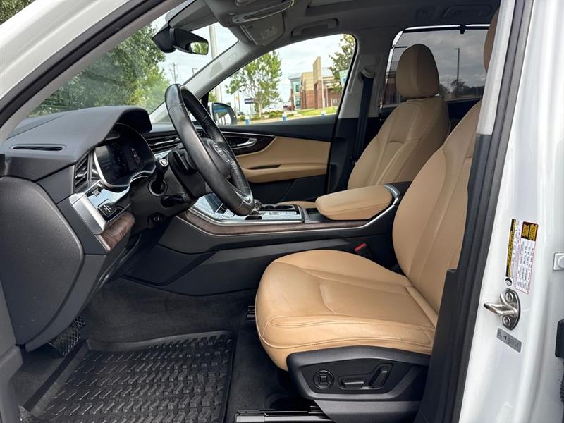 Glacier White 2020 Audi Q7 55 Prestige quattro quattro 8-Speed Automatic with Tiptronic 3.0L TFSI V6 DOHC 40 Point Used Car Inspection, Full Detail, Q7 55 Prestige quattro, 4D Sport Utility, 3.0L TFSI V6 DOHC, 8-Speed Automatic with Tiptronic, quattro, Glacier White, Saiga Beige Leather, 3-Spoke Multifunction Steering Wheel w/Paddles, 3D Bose Surround Sound System, 4-Zone Automatic Climate Control, Alu Touch-Sensitive Interior Buttons, Ambient Interior Lighting Package, Audi Active Lane Assist w/Emergency Assist, Audi Adaptive Cruise Assist w/Traffic Jam Assist, Audi Phone Box w/Wireless Charging, Audi Side Assist w/Pre Sense Rear, Black Rubber All-Weather Floor Mats (Set of 4), Cold Weather Package, Comfort Adaptive Air Suspension, Convenience Package, Driver & Passenger Front Seats w/Ventilation, Driver Assistance Package, Dual-Pane Acoustic Side Windows, Exterior Parking Camera Rear, Garage door transmitter: HomeLink, Head-Up Display, Heated Auto-Dimming Power Folding Exterior Mirrors, Heated front seats, Heated Rear Seats, Illuminated Door Sills, Intersection Assist, Matrix-Design LED Headlights, Memory seat, Multicolor Contour/Ambient LED Interior Lighting Pkg, Navigation system: Audi MMI Navigation plus with Touch Response, Power Liftgate, Power moonroof, Power Soft-Closing Doors, Prestige Package, Rear Door/Side Windows & Tailgate Sunshades, Topview Camera System, Tow Hitch Receiver, Towing Package, Traffic Sign Recognition, Warm Weather Package, Wheels: 20" 5-Spoke Turbine-Design.