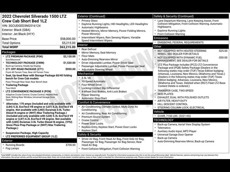 Black 2022 Chevrolet Silverado 1500 LTZ 4WD 10-Speed Automatic EcoTec3 5.3L V8 40 Point Used Car Inspection, Full Detail, Silverado 1500 LTZ, 4D Crew Cab, EcoTec3 5.3L V8, 10-Speed Automatic, 4WD, Black, Black Leather, 10-Way Power Driver Seat w/Lumbar, 10-Way Power Passenger Seat Adjuster w/Lumbar, 12.3" Multicolor Reconfigurable Digital Display, 120-Volt Bed Mounted Power Outlet, 120-Volt Instrument Panel Power Outlet, 15" Diagonal Multicolor Head-Up Display, 2 USB Data Ports, 2nd Row Heated Outboard Seats, Adaptive Cruise Control, Auto-Dimming Inside Rear-View Mirror, Auto-Locking Rear Differential, Bed View Camera, Bluetooth® For Phone, Chevrolet Connected Access Capable, Chrome Mirror Caps, Color-Keyed Carpeting Floor Covering, Compass, Deep-Tinted Glass, Driver Memory, Dual Exhaust w/Polished Outlets, Dual Rear USB Ports (Charge Only), Electric Rear-Window Defogger, Electrical Steering Column Lock, Electronic Cruise Control, Floor Mounted Center Console, Front Frame-Mounted Black Recovery Hooks, Front LED Fog Lamps, Front Rainsensing Wipers, Front Rubberized Vinyl Floor Mats, HD Surround Vision, Heated Driver & Front Outboard Passenger Seats, Heated Steering Wheel, Heavy-Duty Air Filter, High Capacity Suspension Package, Hill Descent Control, Hitch Guidance, Hitch Guidance w/Hitch View, Integrated Trailer Brake Controller, Keyless Open & Start, Leather Wrapped Steering Wheel, LED Cargo Area Lighting, LTZ Convenience Package, LTZ Convenience Package II, LTZ Plus Package, LTZ Premium Package, Off-Road Suspension, OnStar & Chevrolet Connected Services Capable, Outside Heated Power-Adjustable Mirrors, Perimeter Lighting, Power Front Passenger Windows w/Express Up/Down, Power Front Windows w/Driver Express Up/Down, Power Rear Windows w/Express Down, Power Sliding Rear Window w/Rear Defogger, Power Sunroof, Power Tailgate, Power Tilt & Telescoping Steering Column, Preferred Equipment Group 1LZ, Premium Bose 7-Speaker Sound System, Rear Camera Mirror, Rear Cross Traffic Alert-Braking, Rear Pedestrian Detection, Rear Rubberized-Vinyl Floor Mats, Rear Wheelhouse Liners, Remote Vehicle Starter System, Safety Alert Seat, Safety Package, SiriusXM w/360L, Standard Tailgate, Steering Wheel Audio Controls, Technology Package, Theft Deterrent System (Unauthorized Entry), Trailer Camera Provisions, Trailer Side Blind Zone Alert, Trailering App, Trailering Package, Ultrasonic Front & Rear Park Assist, Universal Home Remote, Up-Level Rear Seat w/Storage Package, Ventilated Driver & Front Passenger Seats, Wi-Fi Hot Spot Capable, Wireless Charging, Wireless Phone Projection, Z71 Off-Road Package.