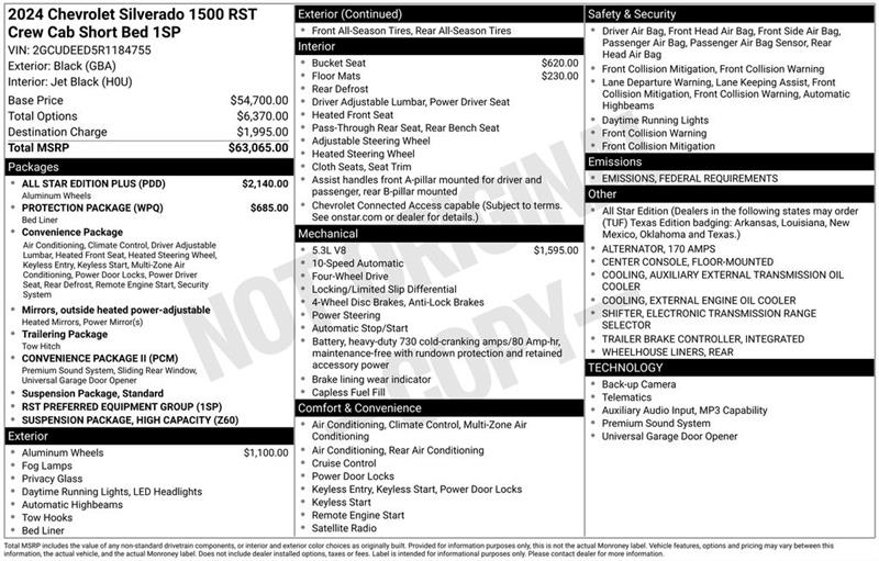 Black 2024 Chevrolet Silverado 1500 RST 4WD 10-Speed Automatic EcoTec3 5.3L V8 40 Point Used Car Inspection, Full Detail, Silverado 1500 RST, 4D Crew Cab, EcoTec3 5.3L V8, 10-Speed Automatic, 4WD, Black, Black Cloth, 10-Way Power Driver Seat w/Lumbar, 12.3" Multicolor Reconfigurable Digital Display, 120-Volt Bed Mounted Power Outlet, 120-Volt Interior Power Outlet, 220 Amp Alternator, 6-Speaker Audio System, All Star Edition Plus, All-Star Edition, Auto-Locking Rear Differential, Bluetooth® For Phone, Chevrolet Connected Access Capable, Chevytec Spray-On Black Bedliner, Cloth Seat Trim, Color-Keyed Carpeting Floor Covering, Convenience Package, Convenience Package II, Deep-Tinted Glass, Dual Rear USB Ports (Charge Only), Dual-Zone Automatic Climate Control, Electric Rear-Window Defogger, Electrical Steering Column Lock, Electronic Cruise Control, Electronic Stability Control, External Engine Oil Cooler, EZ Lift Power Lock & Release Tailgate, Forward Collision Alert, Front fog lights, Front Frame-Mounted Black Recovery Hooks, Front LED Fog Lamps, Front Pedestrian Braking, Front Rubberized Vinyl Floor Mats, Fully automatic headlights, HD Rear Vision Camera, Heated Driver & Front Outboard Passenger Seats, Heated Power-Adjustable Outside Mirrors, Heated Steering Wheel, High Capacity Suspension Package, High Gloss Black Mirror Caps, Hitch Guidance, Hitch Guidance w/Hitch View, In-Vehicle Trailering System App, Inside Rear-View Mirror w/Tilt, Integrated Trailer Brake Controller, Keyless Open & Start, Lane Keep Assist w/Lane Departure Warning, LED Cargo Area Lighting, OnStar & Chevrolet Connected Services Capable, Power Front Windows w/Driver Express Up/Down, Power Front Windows w/Passenger Express Down, Power Rear Windows w/Express Down, Power Sliding Rear Window w/Rear Defogger, Preferred Equipment Group 1SP, Premium Bose 7-Speaker Sound System, Protection Package, Rear 60/40 Folding Bench Seat (Folds Up), Rear Rubberized-Vinyl Floor Mats, Rear Wheelhouse Liners, Remote Vehicle Starter System, SiriusXM w/360L, Standard Tailgate, Steering Wheel Audio Controls, Theft Deterrent System (Unauthorized Entry), Traction control, Trailering Package, Universal Home Remote, Wheels: 20" x 9" Painted Aluminum, Wi-Fi Hot Spot Capable, Wrapped Steering Wheel.